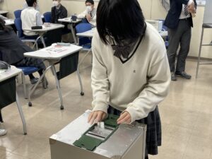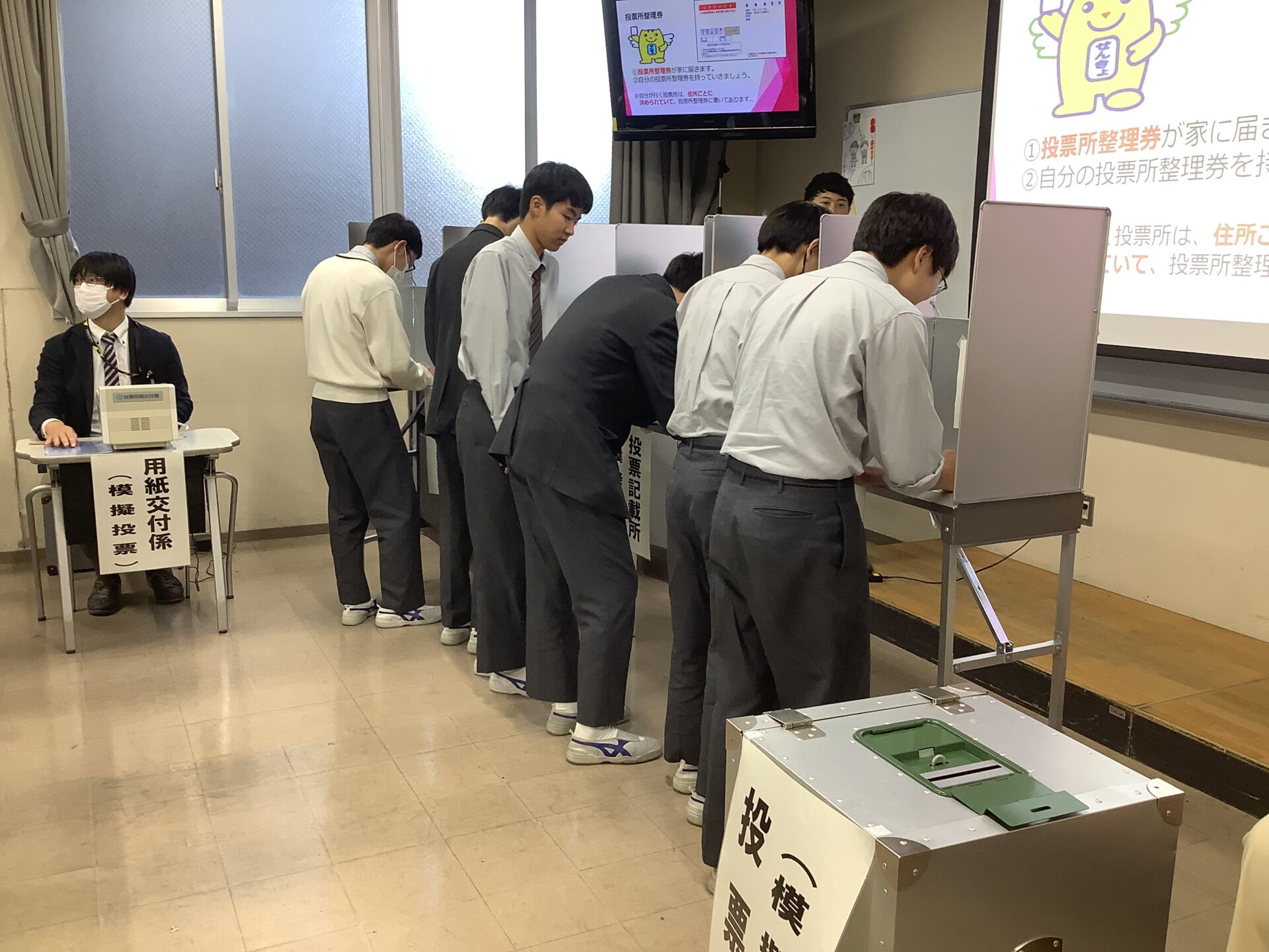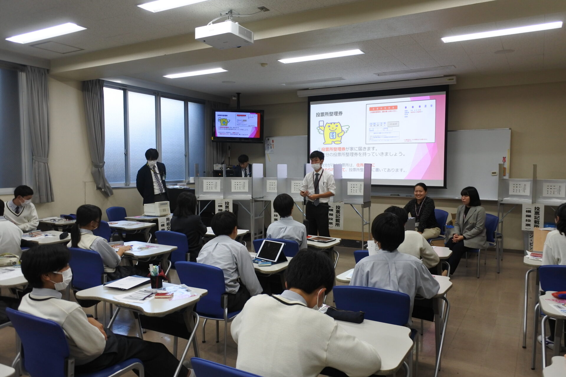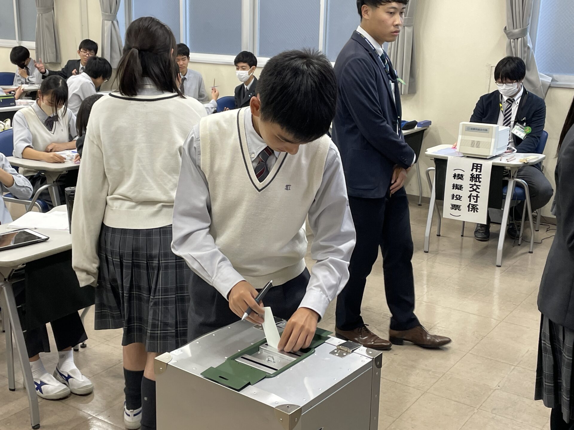 2023年11月8日(水)、中学3年生対象に選挙啓発出前授業を実施しました。この講座はさいたま市選挙管理委員会の方が将来有権者となる生徒たちに、選挙に関する正しい知識や重要性について学習を深め、政治や選挙に関する関心を高めてもらうことを目的としたものです。実際に投票用紙を記入し、模擬投票をするなど、初めての体験に生徒たちは興味津々でした。