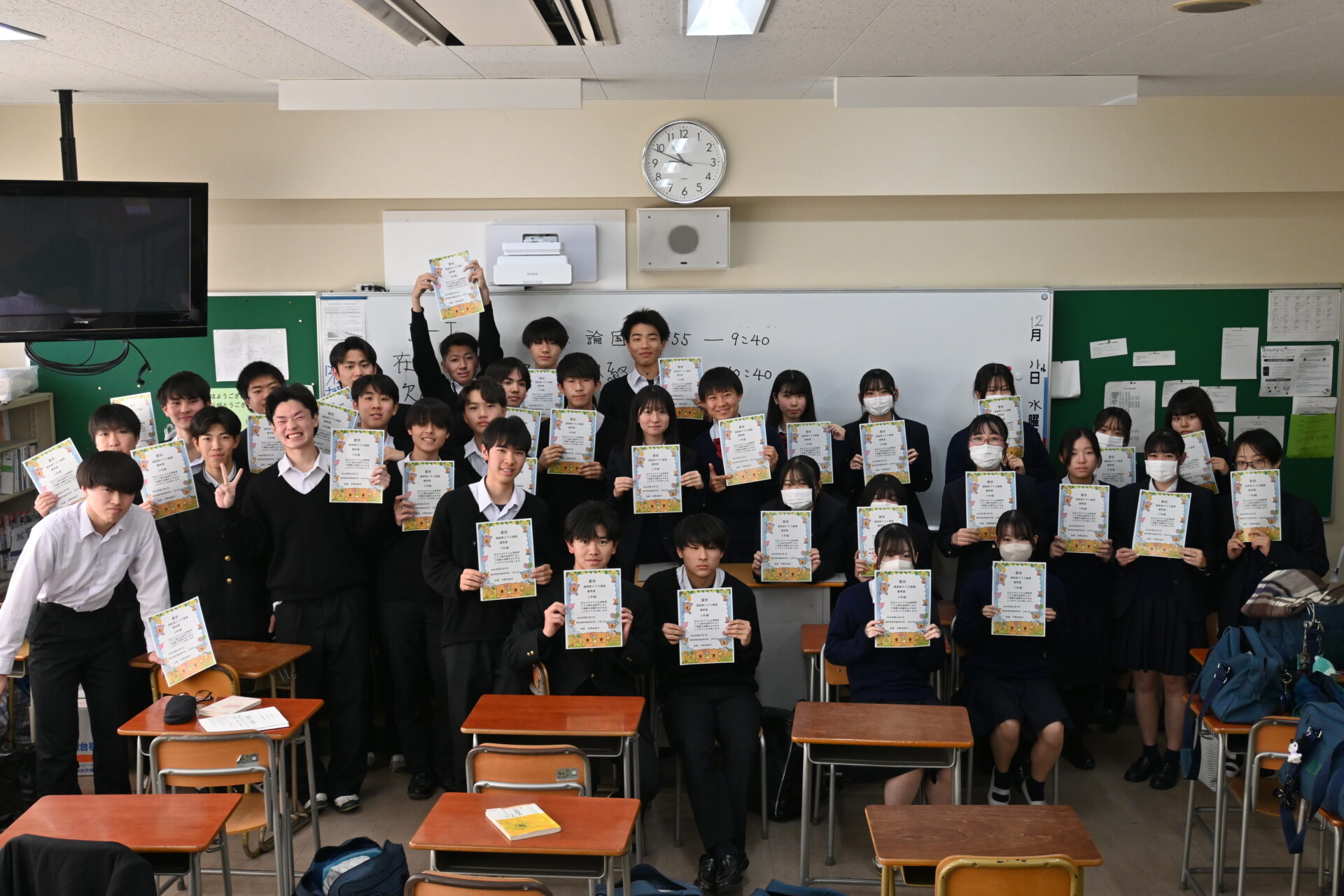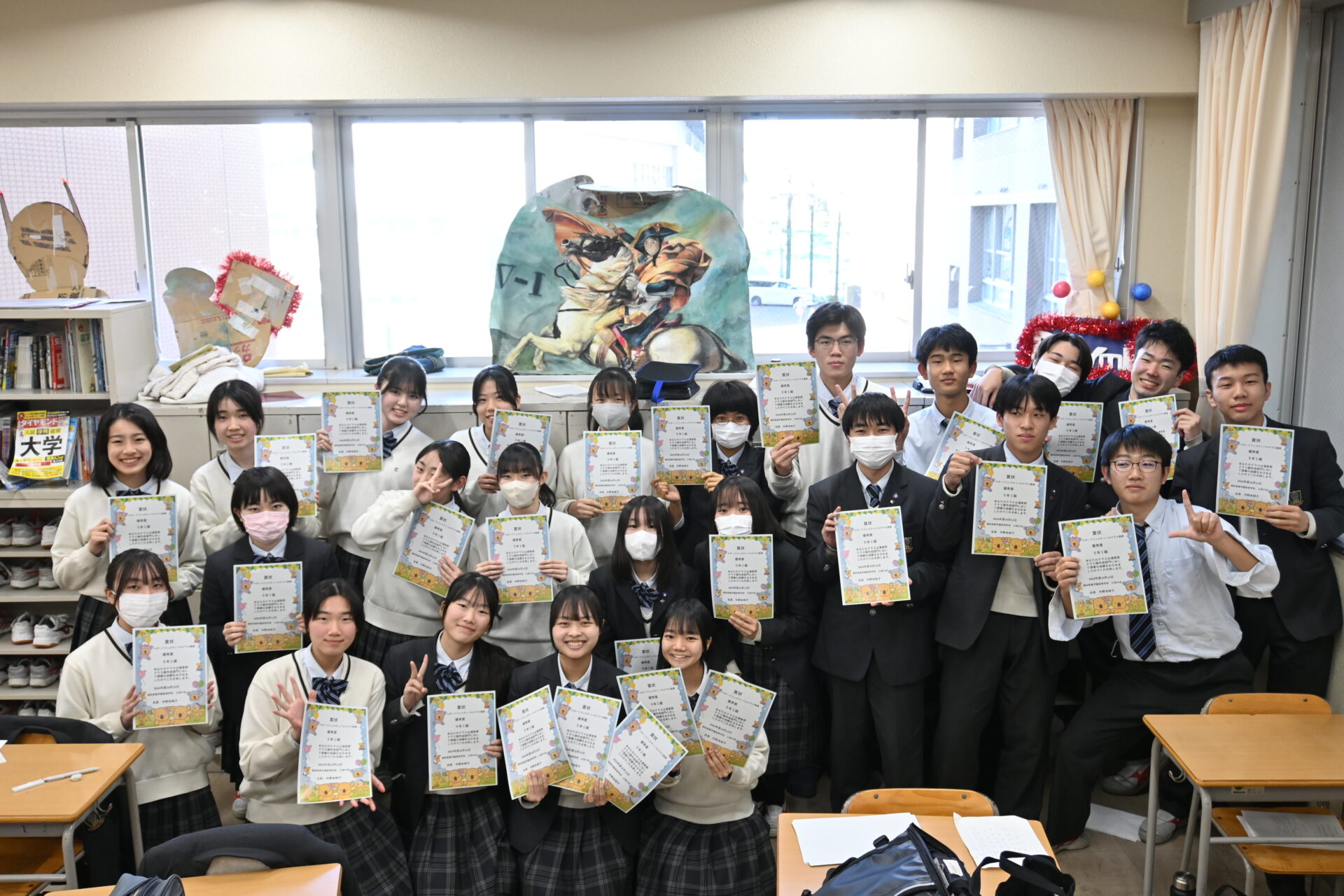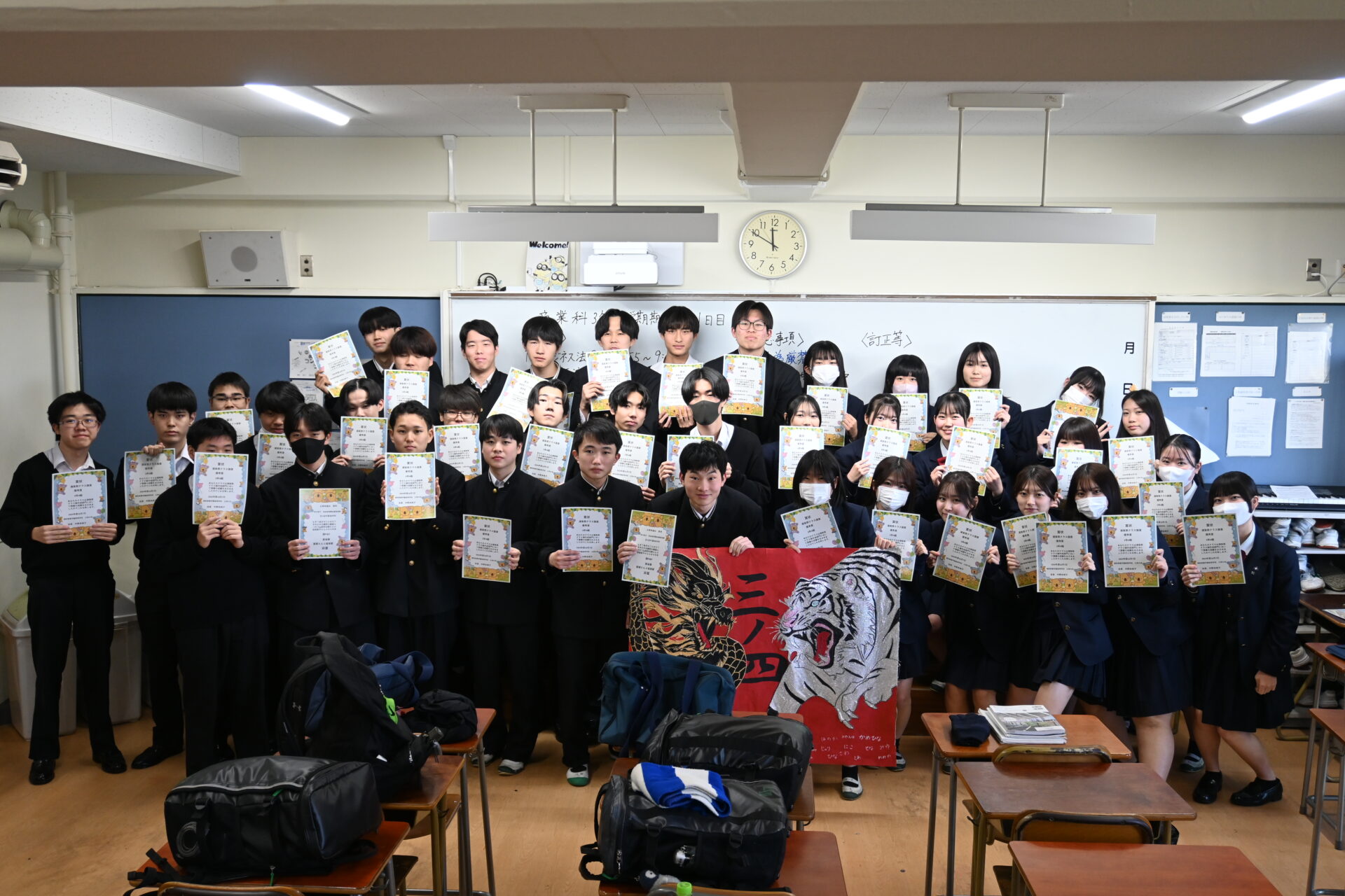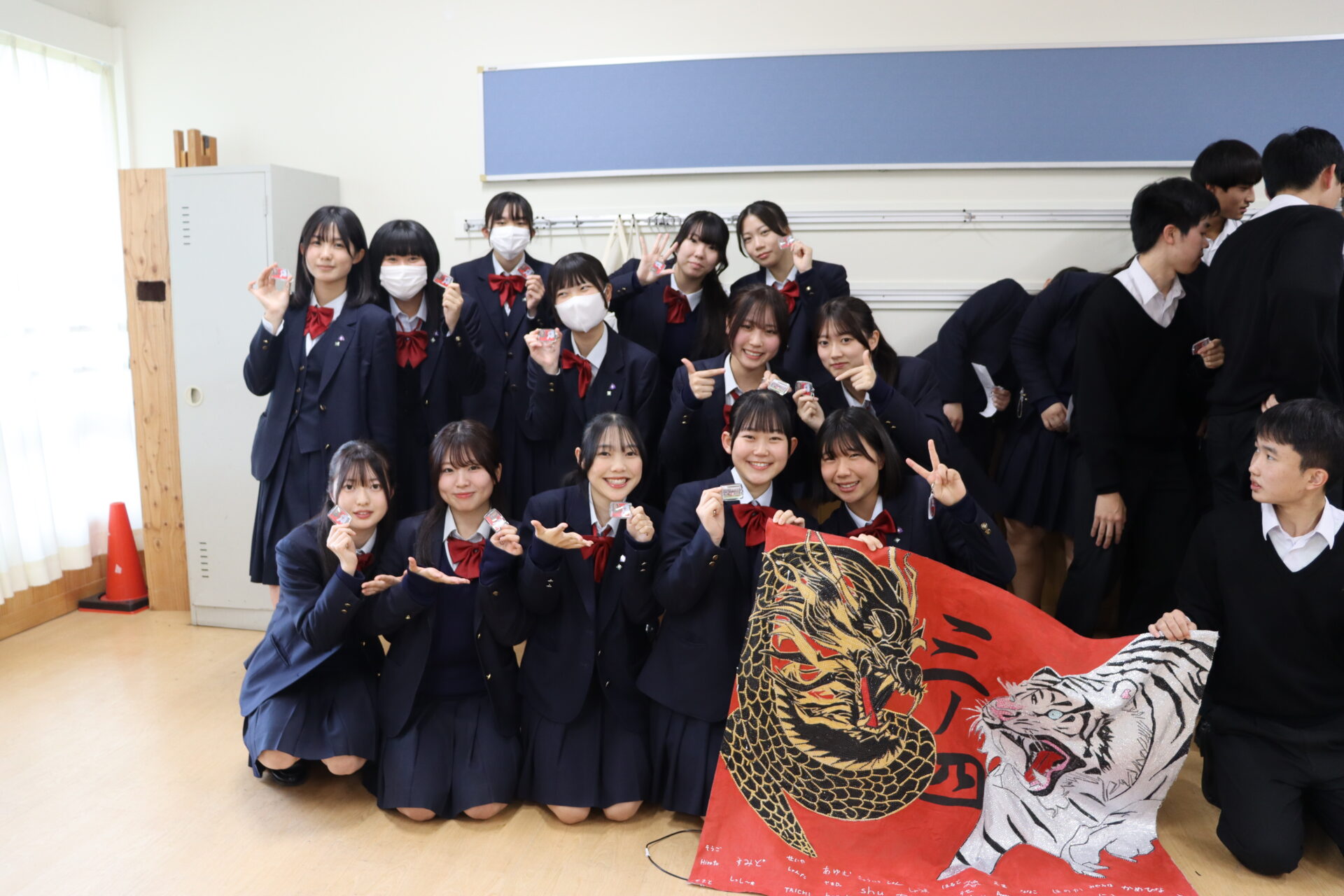 2024年度、体育祭及びスポーツフェスティバルにおいて父母の会主催クラス旗賞 優秀賞を獲得したクラスに特製クラス旗キーホルダーと賞状をプレゼントしました。体育祭から少し時間が経ちましたが、生徒たちは改めて喜びを分かち合っていました。