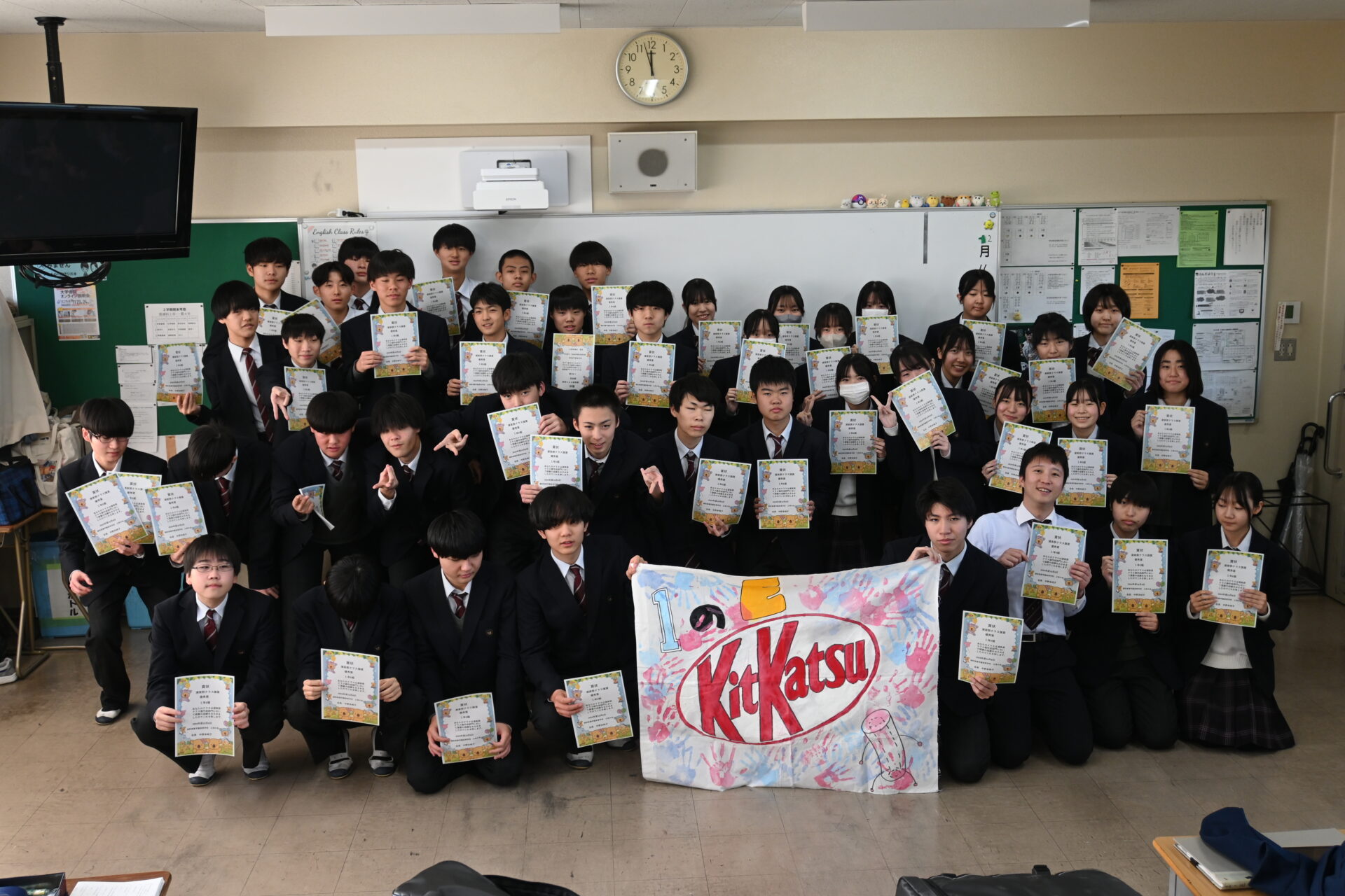 ※株式会社ロッテ様はお菓子屋アイスの製造だけでなく、古紙から再生紙の製造も行っています。本校でも古紙回収にご協力させて頂いており、考査前などに計算用紙として再生紙のご提供を頂いております。今回、コアラのマーチを用いた賞状を作成いただき、優秀賞用の賞状を全生徒分ご提供頂きました。