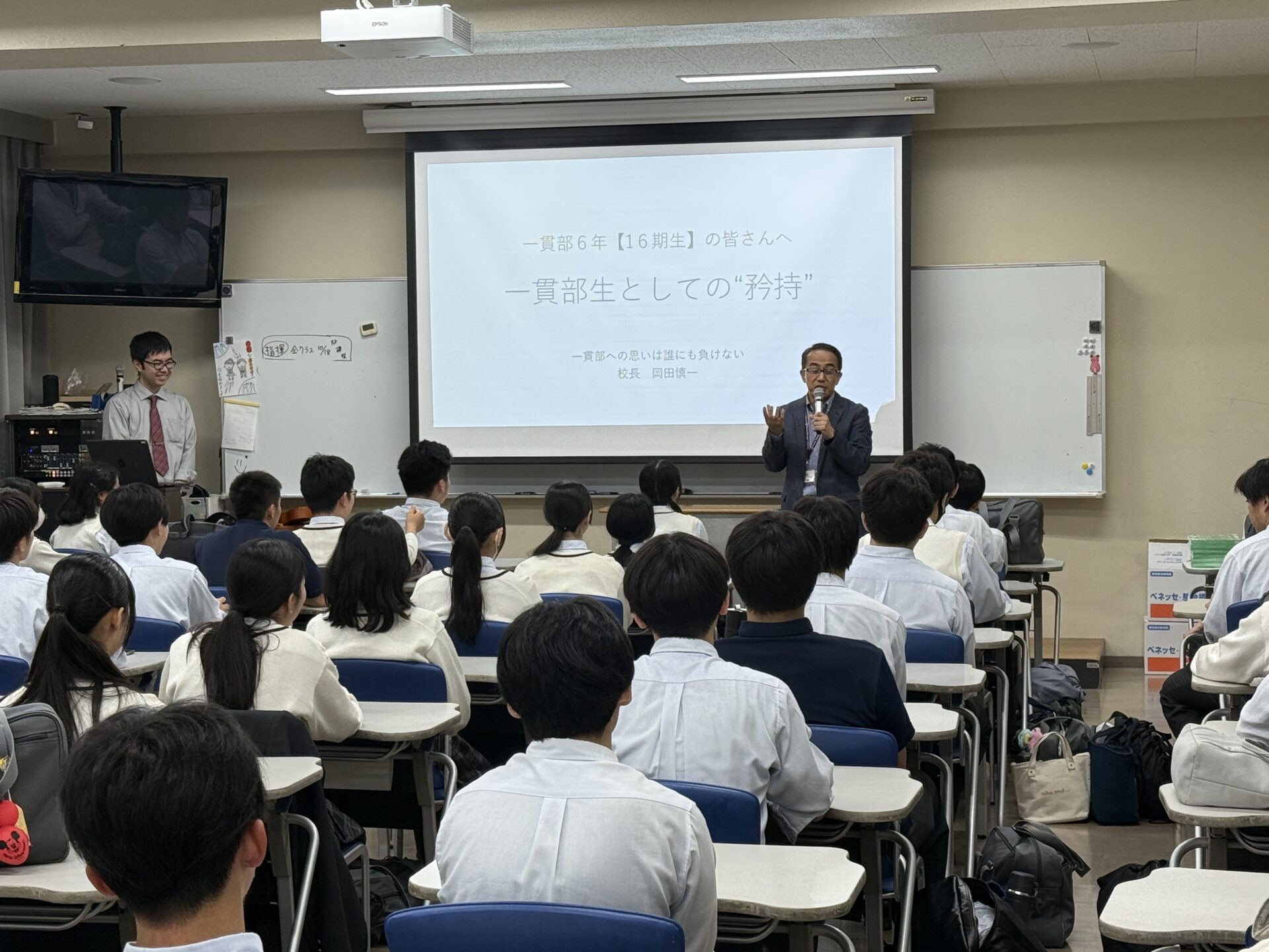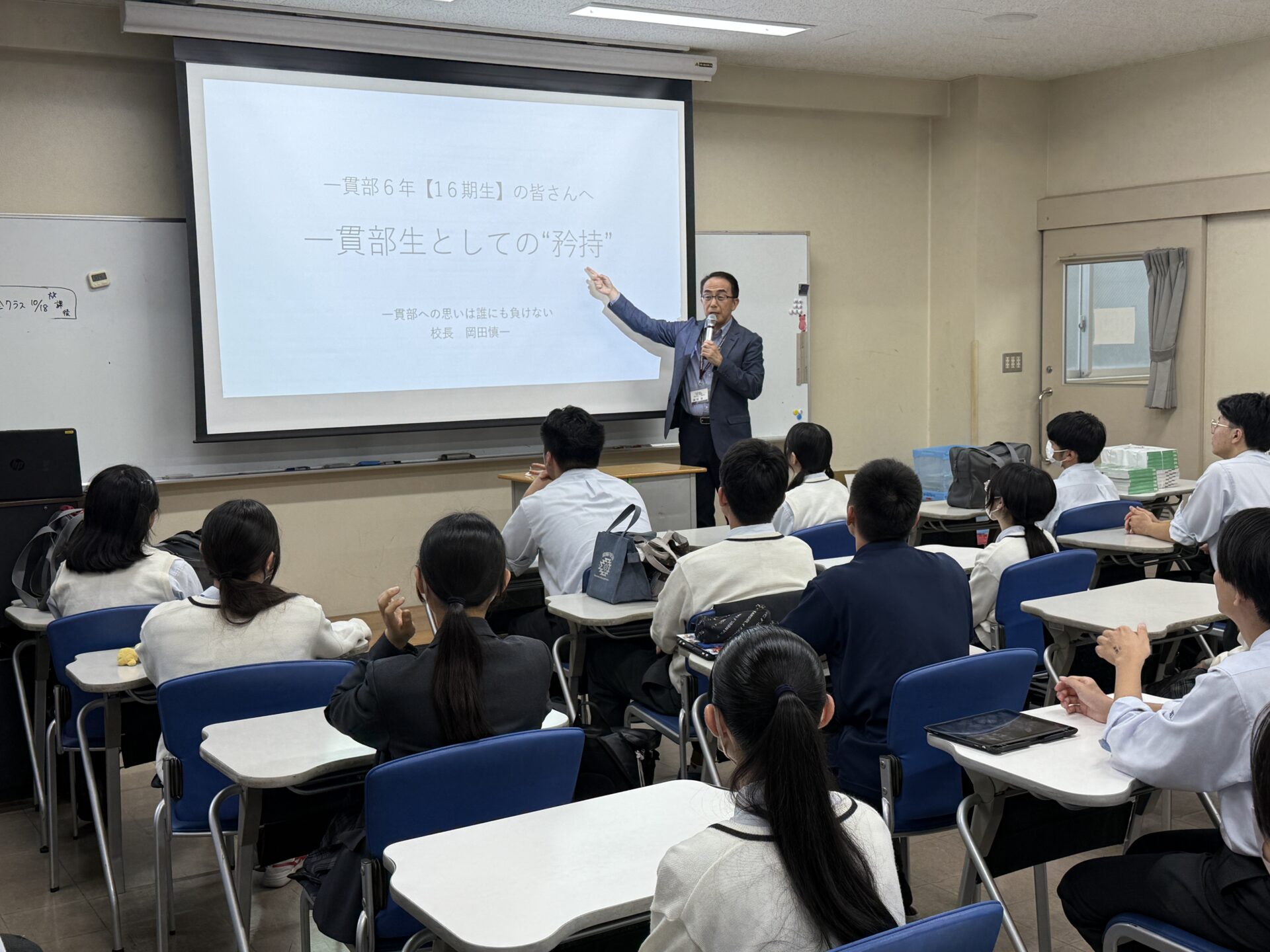 2025年10月16日(木)、6年生を対象に岡田校長による「受験激励会」を実施しました。岡田校長は一貫部の設立に深く関わった人物でもあり、設立当初からの思いや受験に臨む心構えについて、生徒たちに熱く語りかけました。生徒からは「校長先生の一貫部への思いを強く感じ、自分も先輩たちのように結果を残したい」といった感想が寄せられ、受験に向けて新たな決意を固める時間となりました。