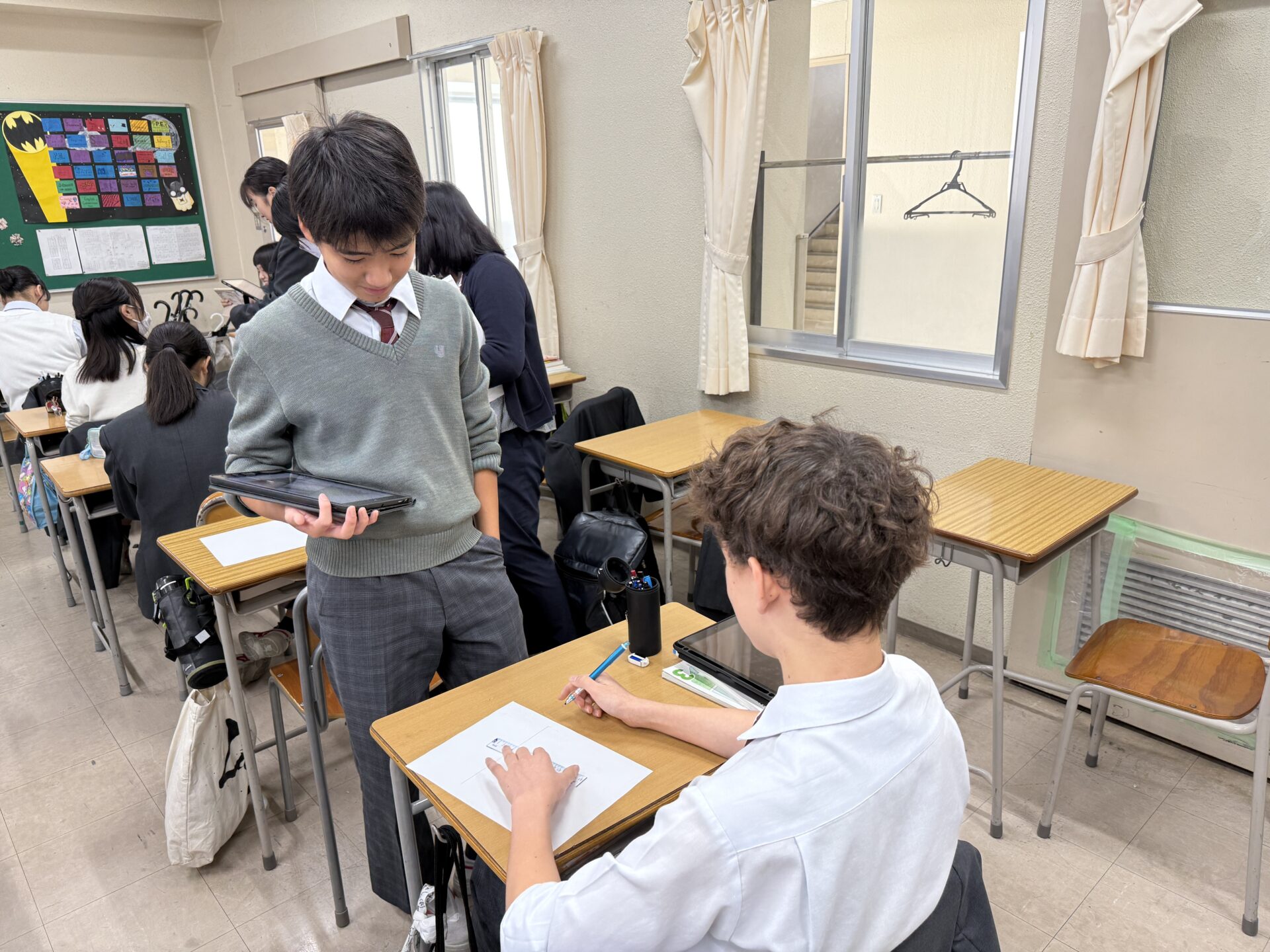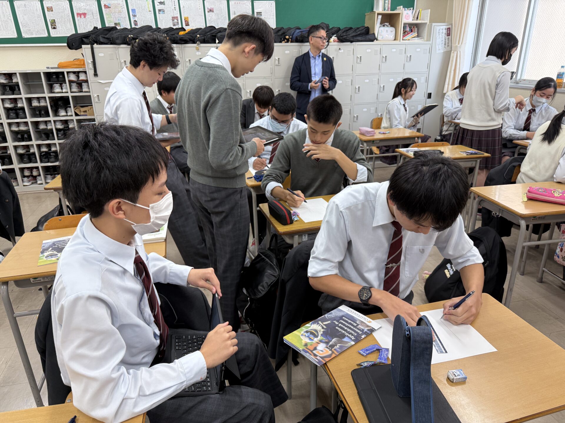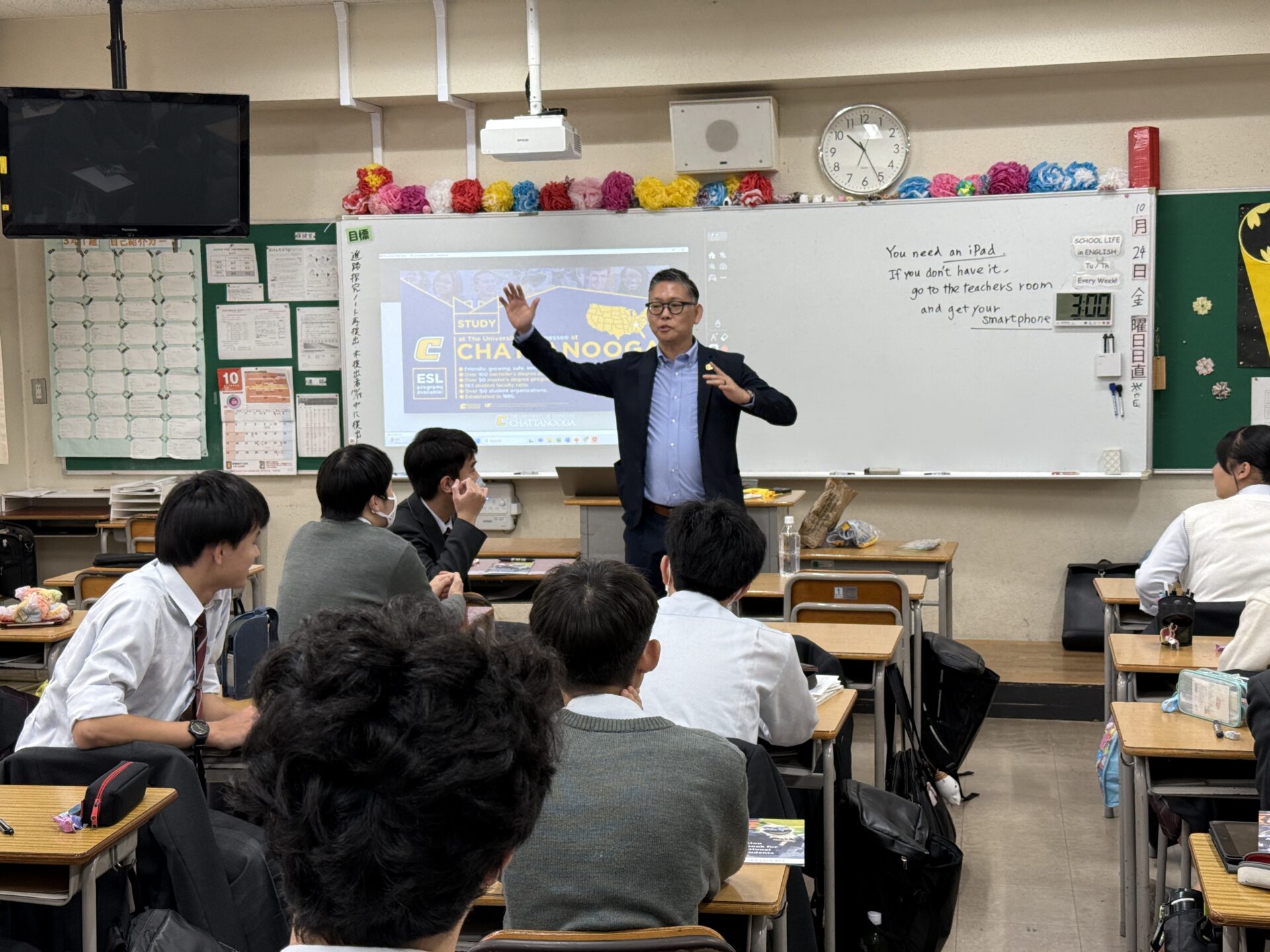 2025年10月27日(月)、中学3年生のイマージョンクラスを対象に、テネシー大学チャタヌーガ校(UTC)のTakeo Suzuki博士による特別講義が行われました。本講義は海外留学・大学進学支援プログラム(SAP)の一環として実施され、生徒たちは「図形を説明する」ペアワークに挑戦。身振り手振り禁止のルールのもと、英語と日本語で試行錯誤を重ね、表現力やコミュニケーション力を磨きました。その後、Suzuki博士からは活動の振り返りを通じて、言葉を用いたコミュニケーションの難しさや大切さ、そして英語学習の工夫について熱く語っていただきました。生徒たちにとって、大きな刺激と学びにあふれた有意義な時間となりました。