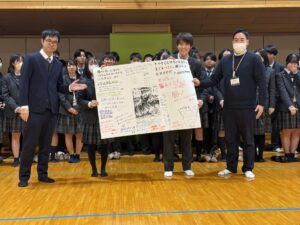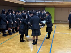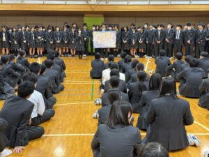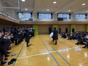 2025年12月24日(水)、まもなく受験本番を迎える6年生を励ますため、壮行会を行いました。4・5年生および教員から、応援の気持ちを込めた寄せ書きが贈られました。6年生代表の小平田くんは、「多くの人に支えられていることへの感謝を胸に、合格掲示板が合格の文字で埋まるよう、最後まで全力で取り組んできます」と力強く決意を述べました。