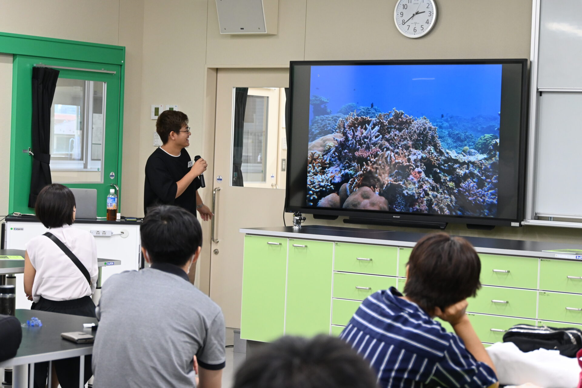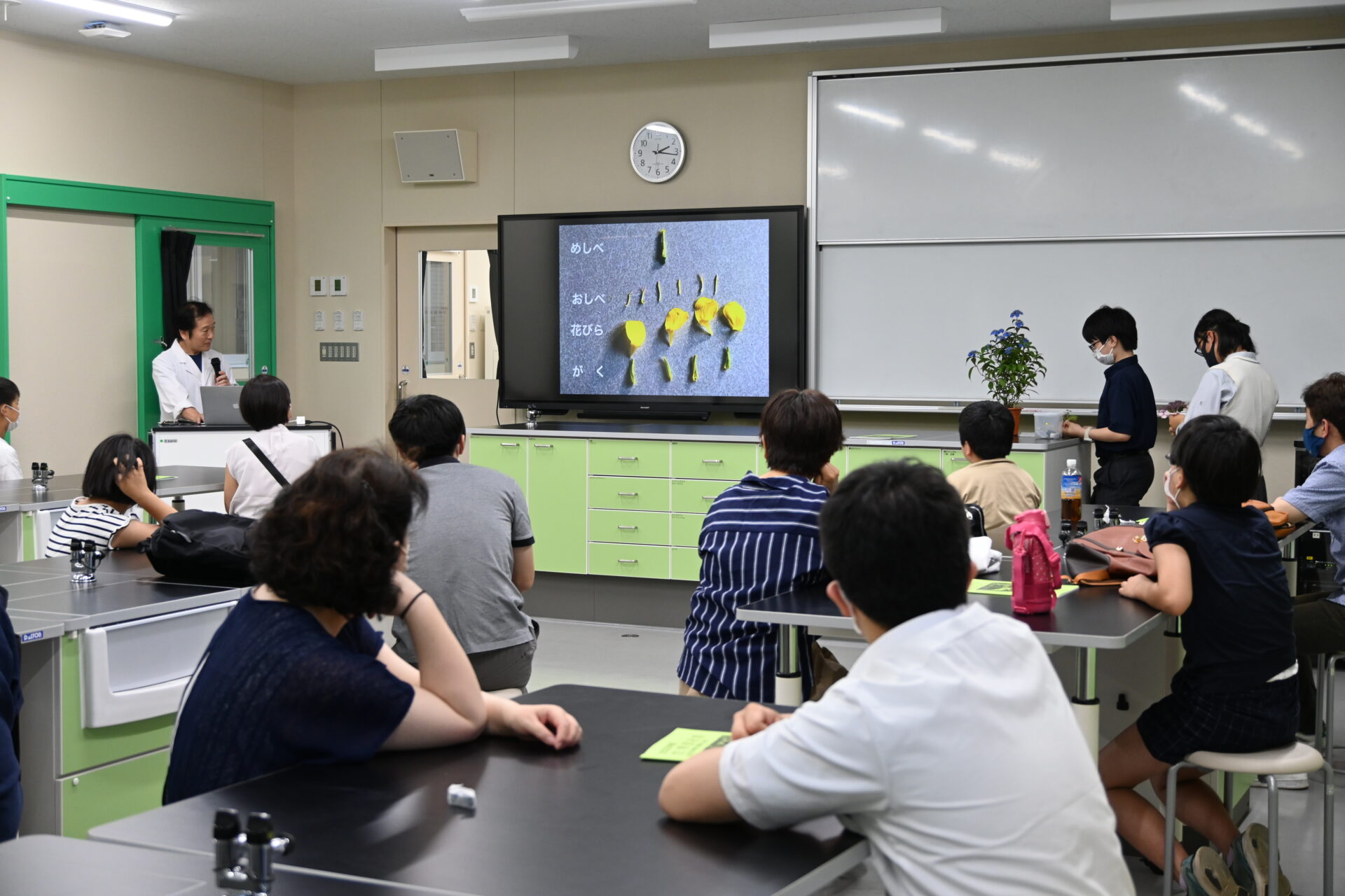 2023年6月17日(土)に小学生対象の第1回生物活動体験を実施しました。合宿や大学見学、野外活動など様々な活動実績を部員たちが紹介した後、アジサイの観察を行いました。アジサイの花のつくりを観察後、花の役割に関する仮説を部員たちが紹介すると、参加していた小学生たちも興味深く、耳を傾けていました。生物部のOBも来校し、自身が沖縄で研究しているサンゴに関して語り、最後は生物を管理している教室を見学し、終了しました。