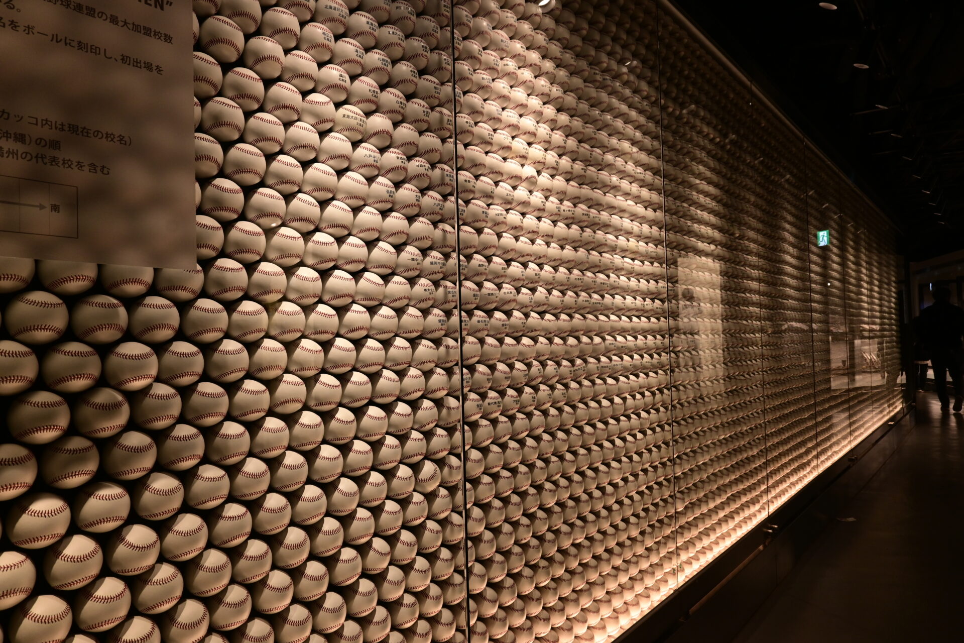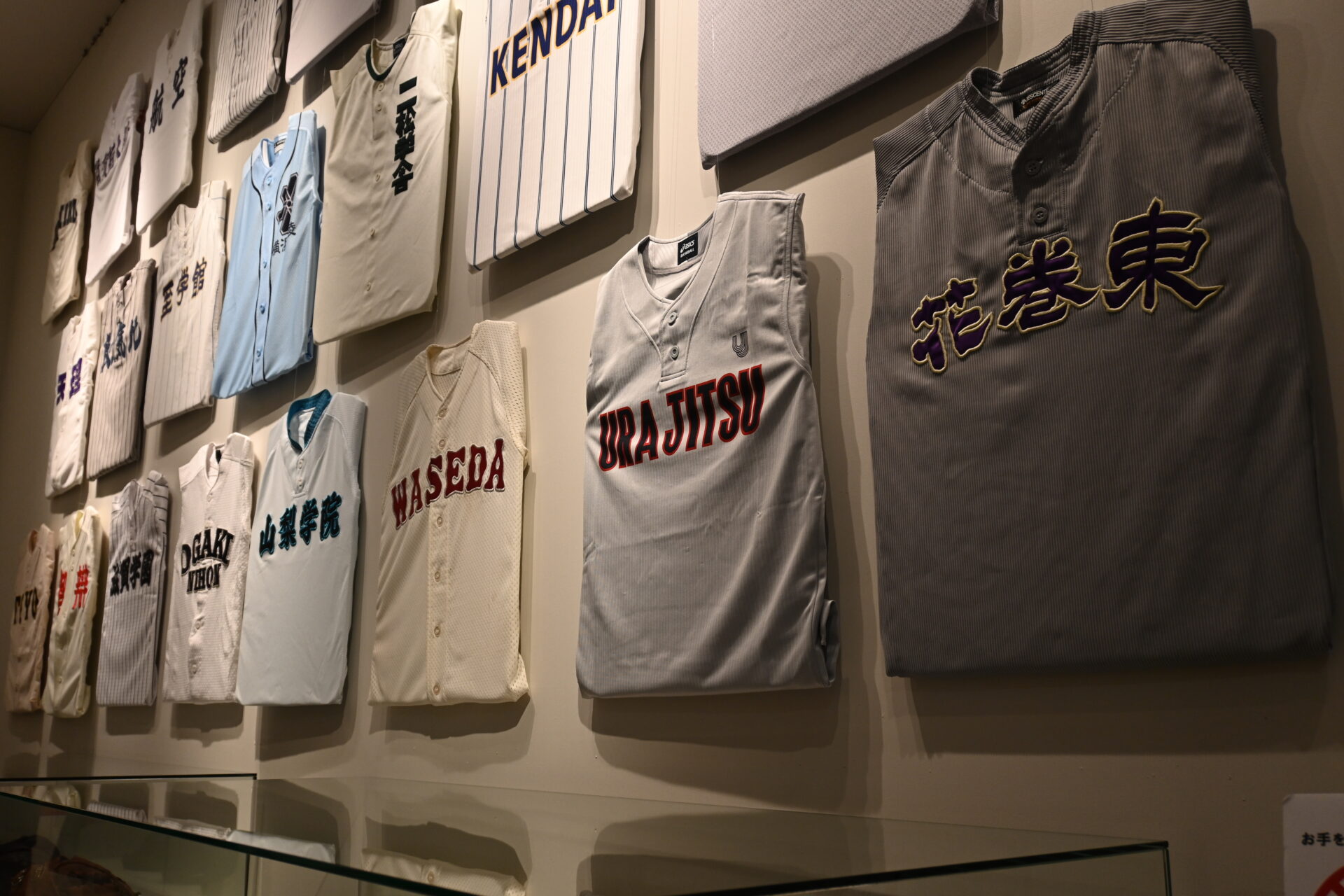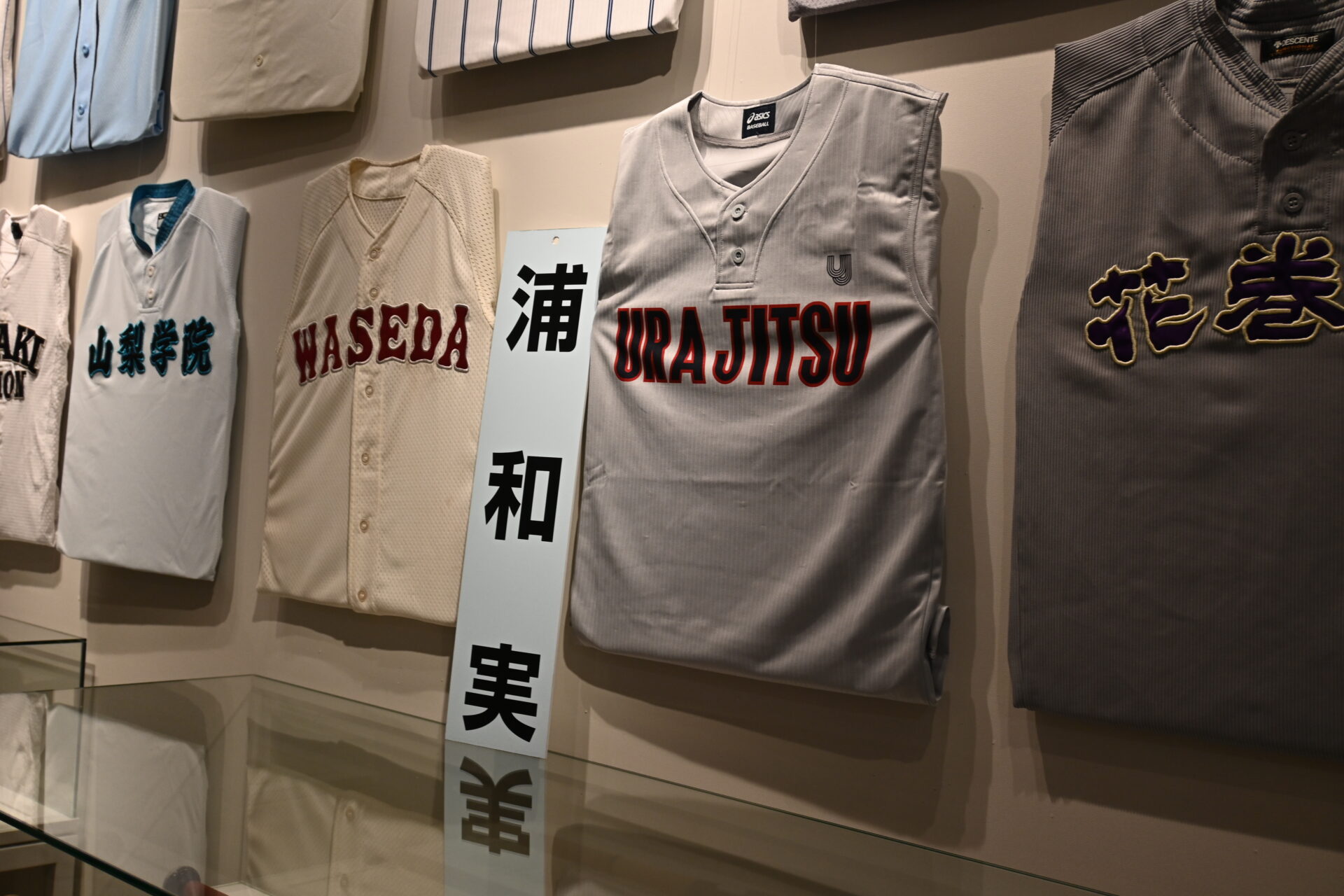 高校野球の名門、早稲田実業高校や花巻東高校のユニフォームに挟まれ、「URAJITSU」の文字も輝いており、組み合わせ抽選会の際に使用された出場校ボードとの記念撮影も可能です。