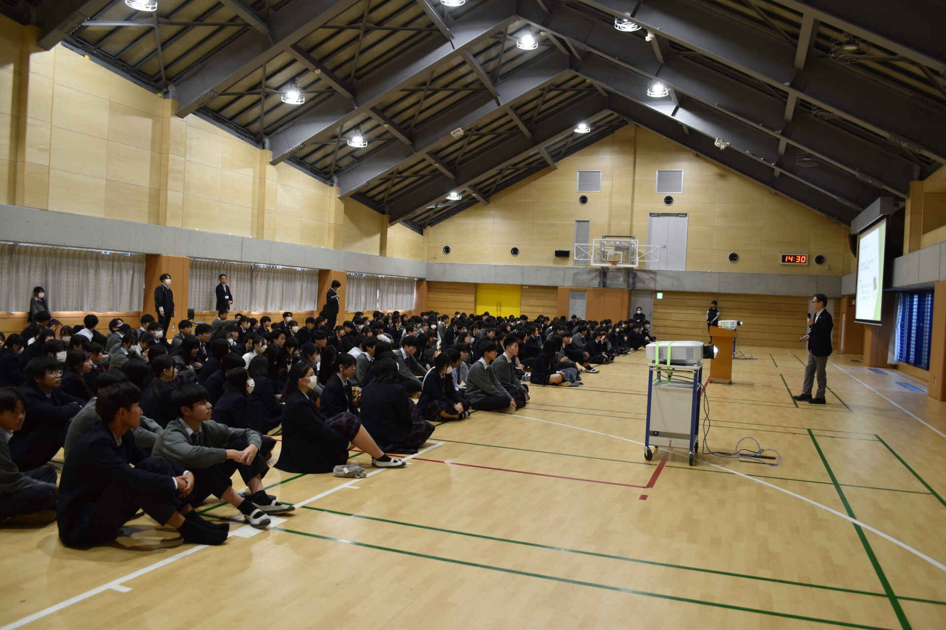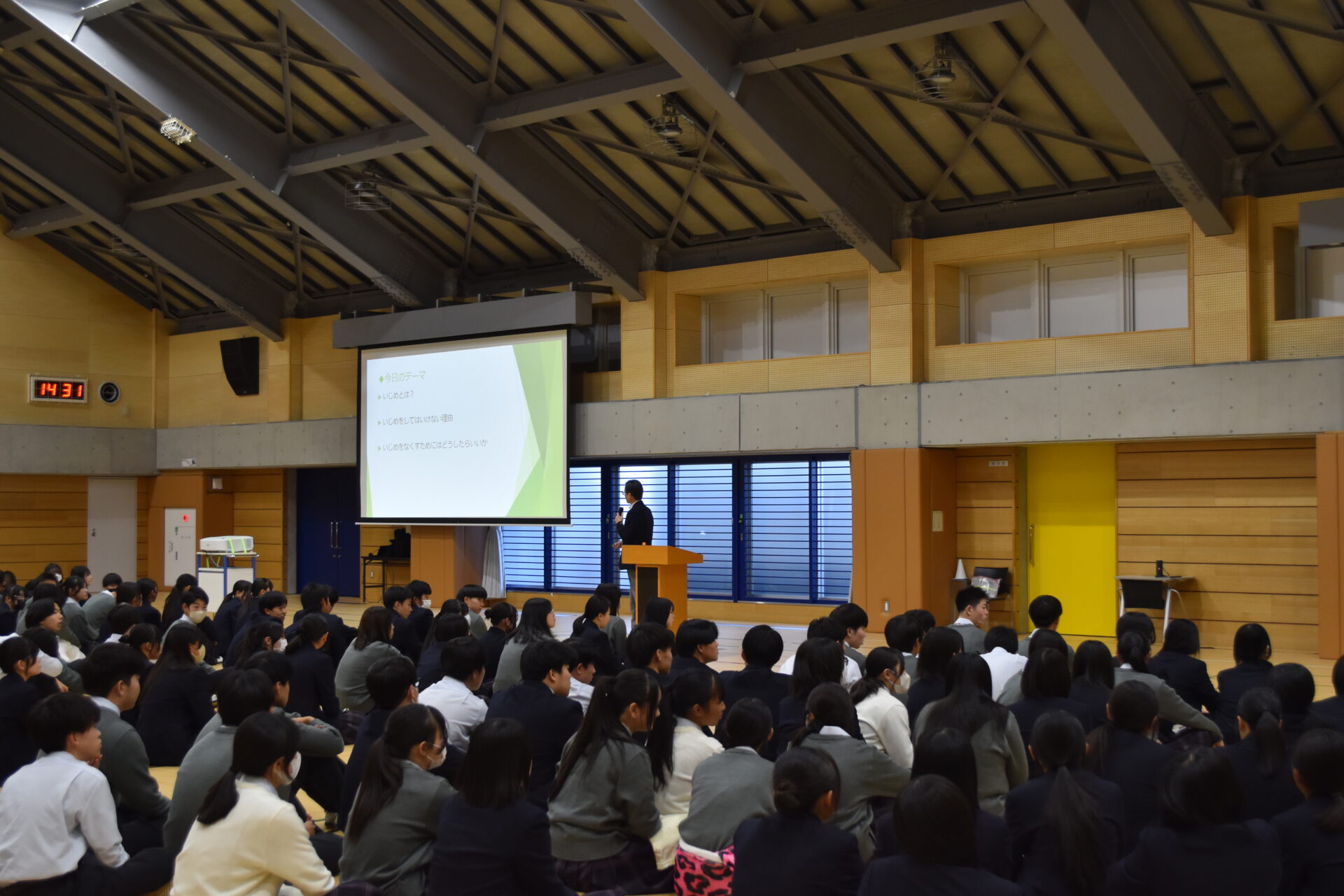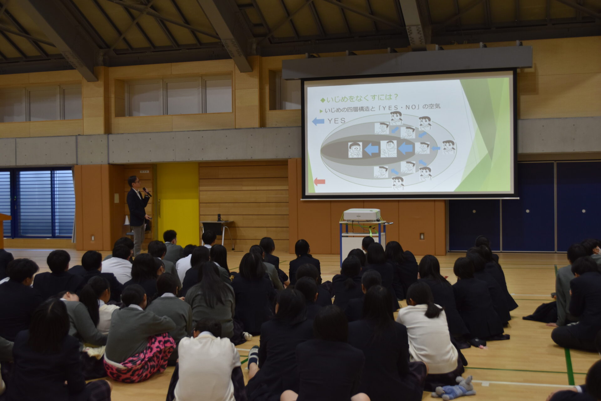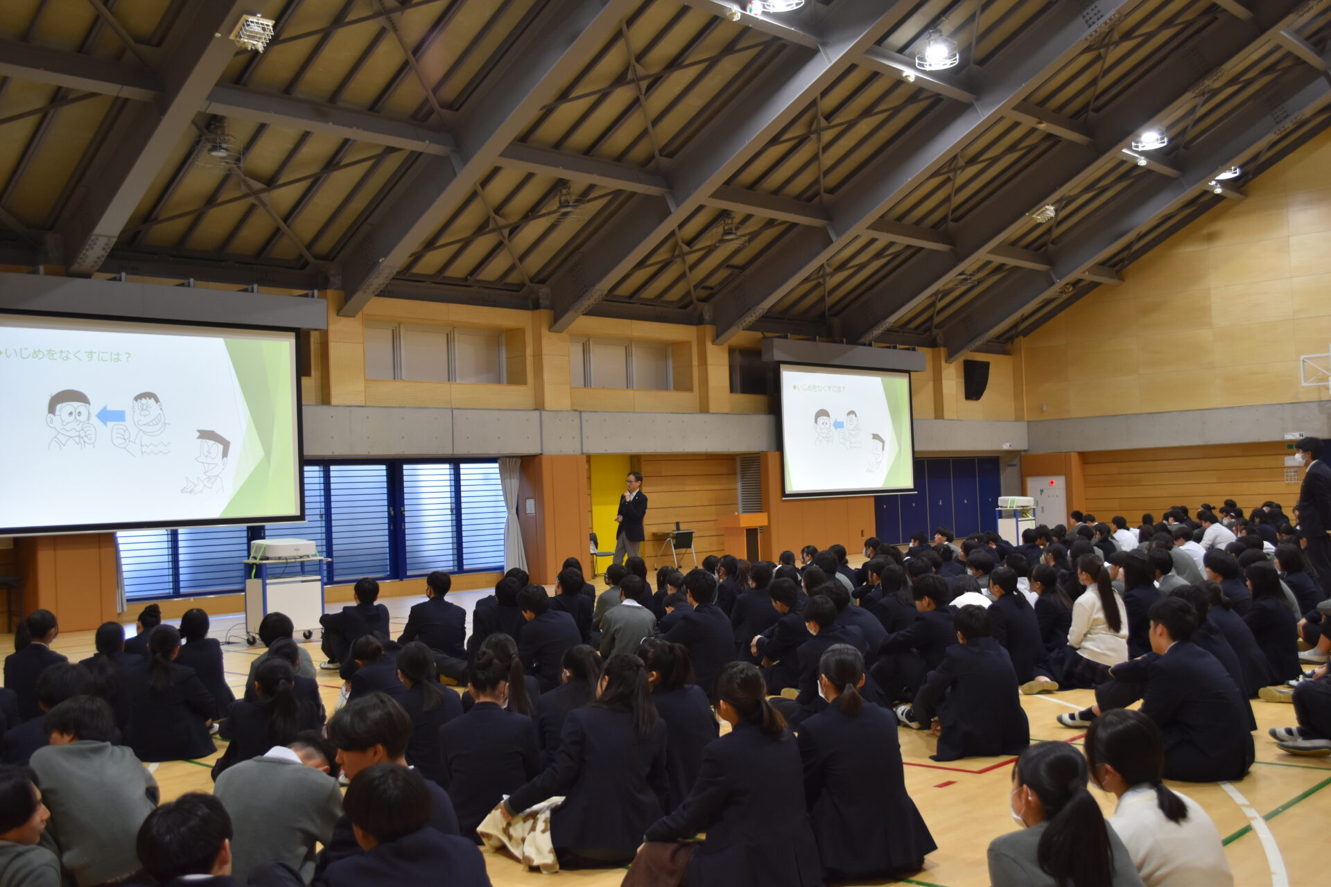 どの行為がいじめにあたるのか、相手を傷つけないために自分ができる行動は何かなど、生徒自身が考えながら取り組めるよう配慮された内容となっており、生徒たちは真剣に話を聞き、日常生活での言動や発信する言葉の重さについて改めて考える様子が見られました。