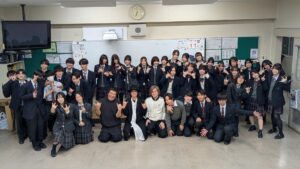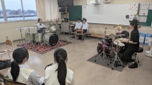 ご自身所有のドラムセットを持ち込まれて行われた1回目のレッスンでは、プロ仕様のドラムに触れさせていただきながら、演奏力の更なる向上とクオリティを高めるべく、2年生を中心としたレッスンを行ってくださいました。2回目のレッスンは1年生が中心となりました。バンド内でのドラムの重要性や演奏技術の基本などを丁寧に教えてくださいました。3回目のレッスンはバンド演奏に対する講評が中心となりました。上手く演奏できていない部分を指摘するとともに、改善すべきポイントを理論的に説明してくださいました。また、3回目のレッスンではMAKOTO氏と同期であったギター部OB二人(当時の部長・副部長)も来校してくださいました。お二人とも音楽業界で活躍されており、ギター、ヴォーカル、機材などについて様々な教えを乞うことができました。最後に3人の偉大な先輩から「音楽と同じくらい勉強も大事!」と、期末考査が迫る現実に向き合わなければならい生徒に檄が飛ばされました!
